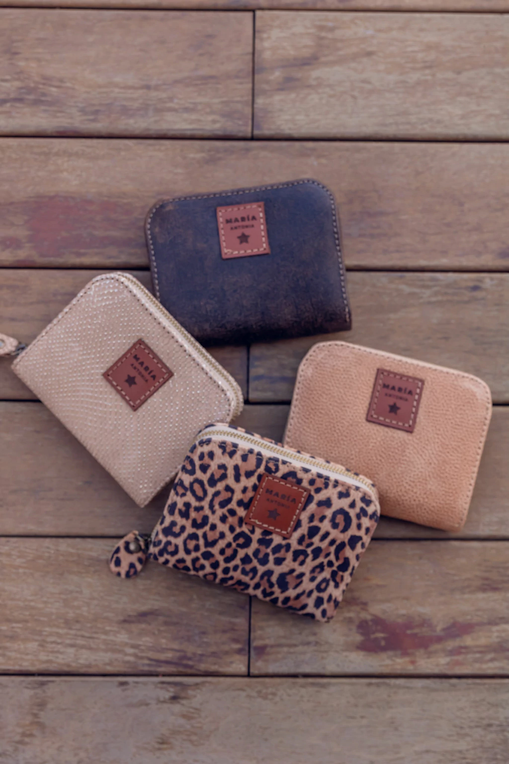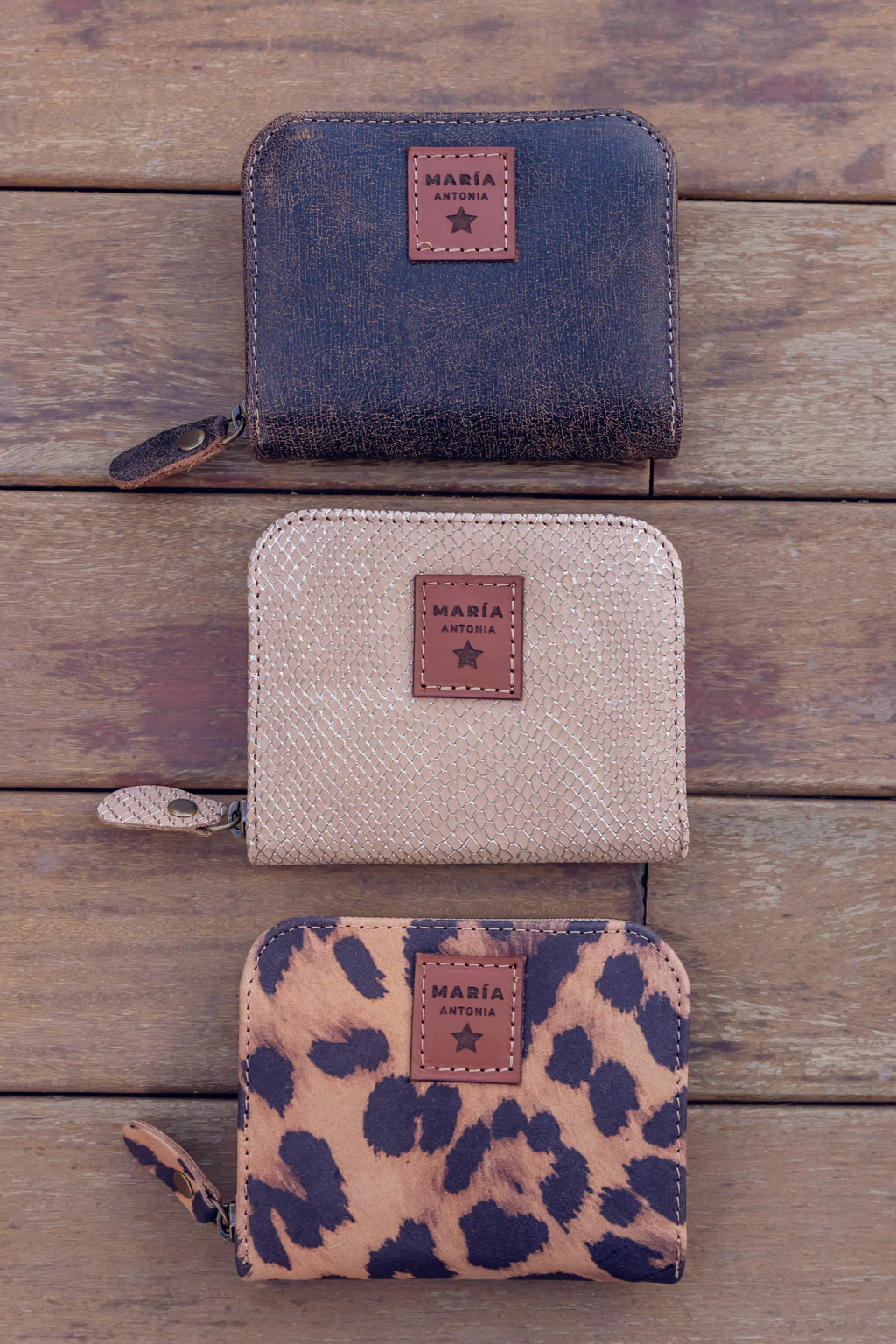 Espacio para 6 tarjetas. Etiqueta de cuero al frente