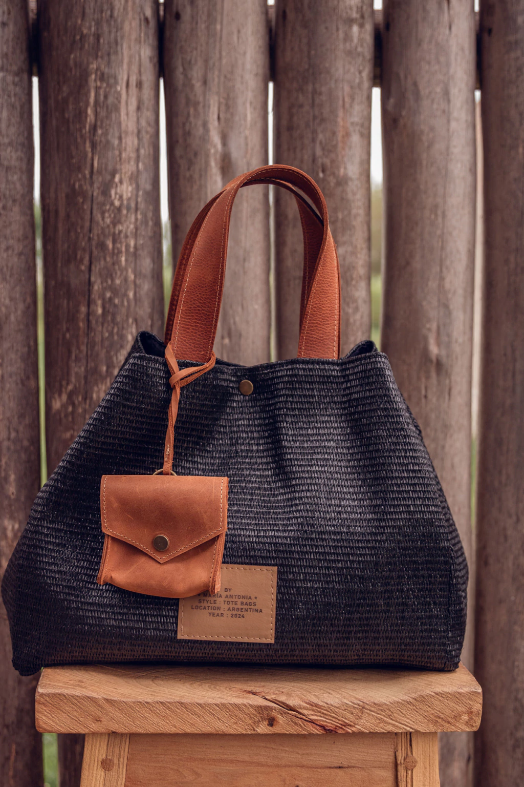 Bolsón de rafia negra, tiene terminación y detalles de cuero, incluye charms de cuero , tiene broche para cerrar , forro y bolsillo interno , correa de cuero