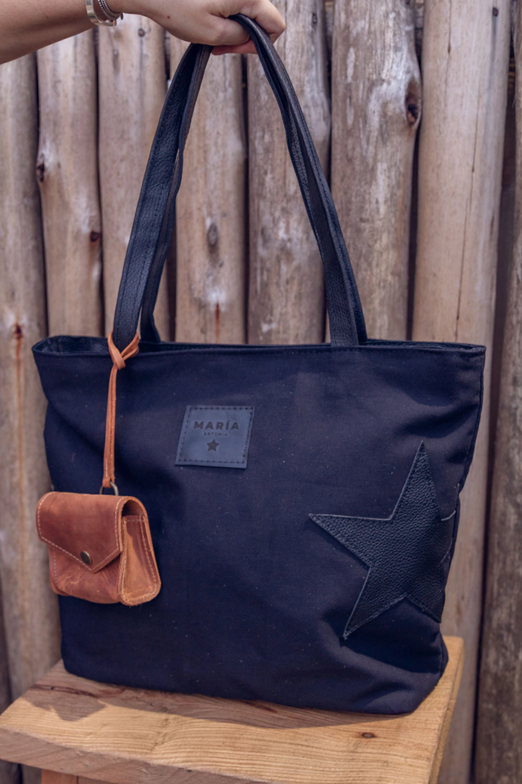 Bolsos de lona realizados con un material grueso y resistente, tiene detalles en cuero, cierre y forro con bolsillo interno. Detalle de estrella al frente, e incluye charms de carterita.