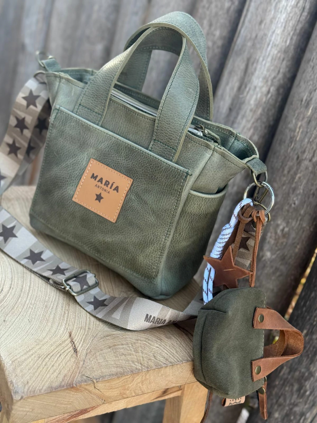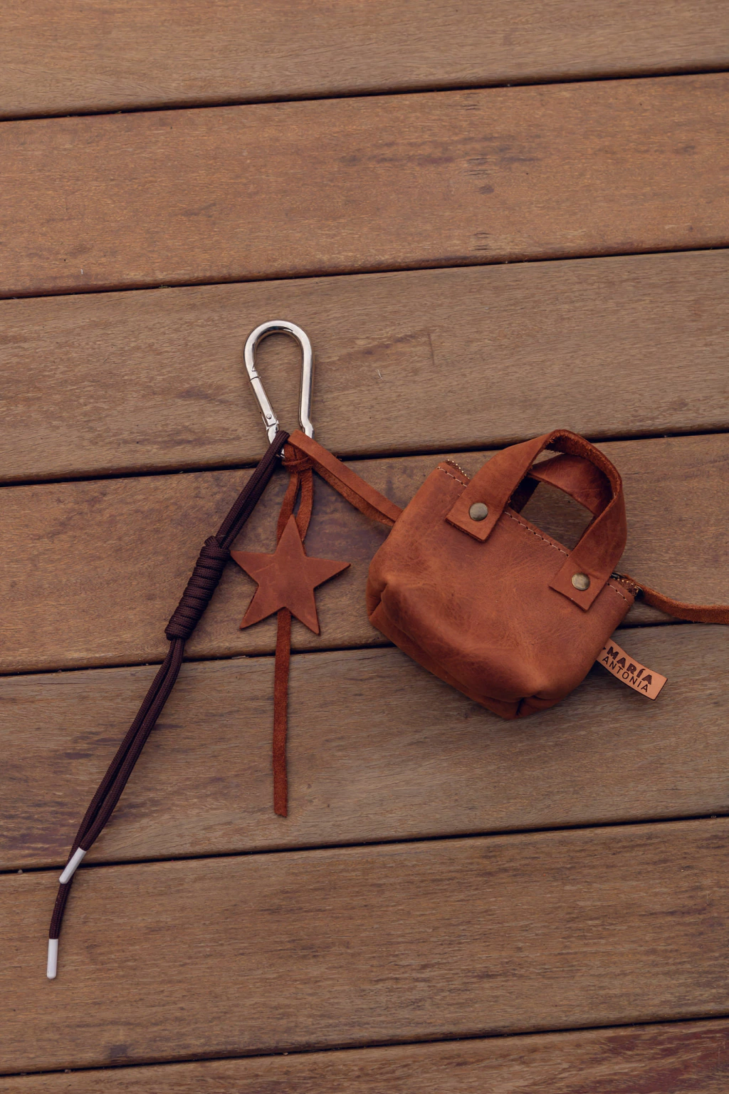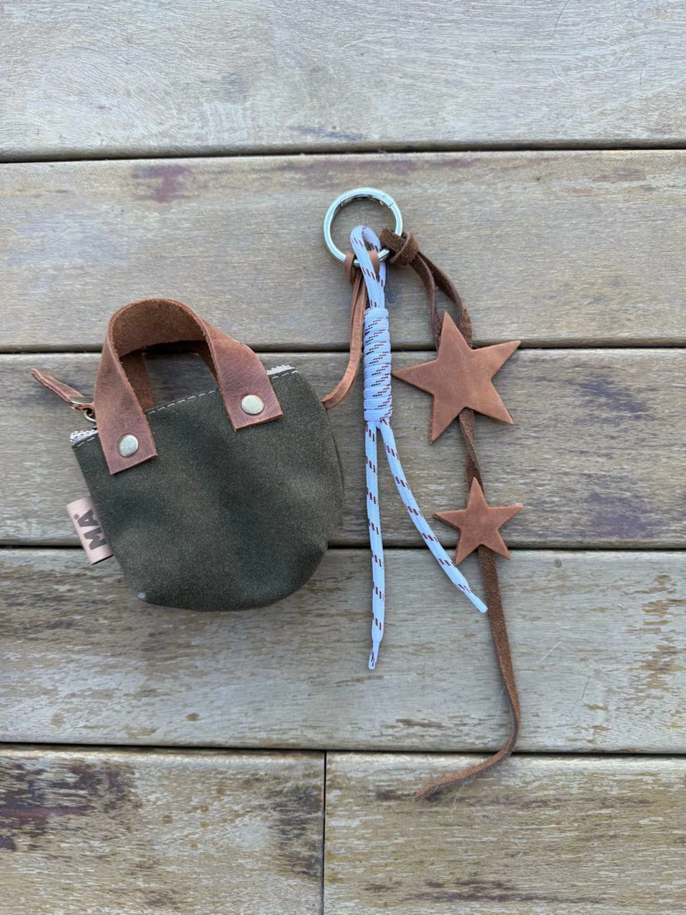 Llavero grande para cartera con gancho reforzado, cordon, dije de estrellas y mini carterita de cuero con cierre metalizado.