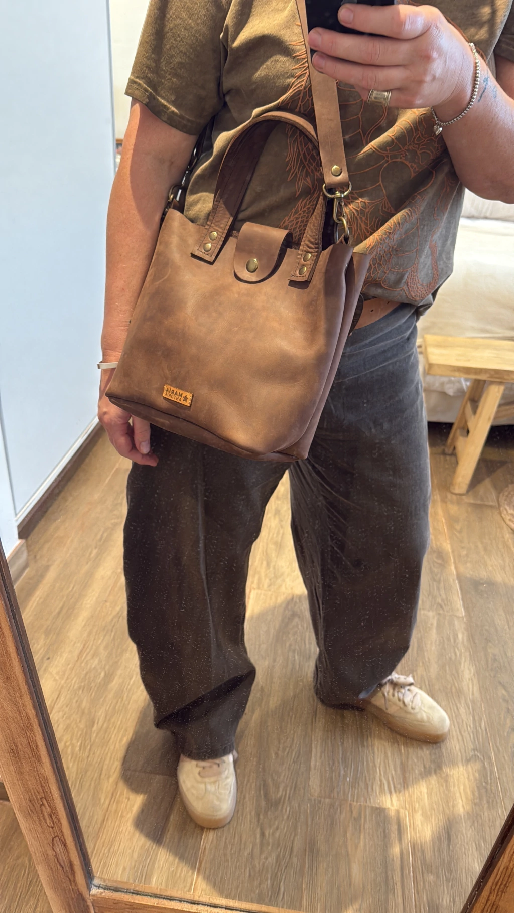 Mini bags de cuero engrasado, gastado y veteado , con doble correa ( corta de mano y larga regulable ) , tiene tapita con broche y bolsillo interno