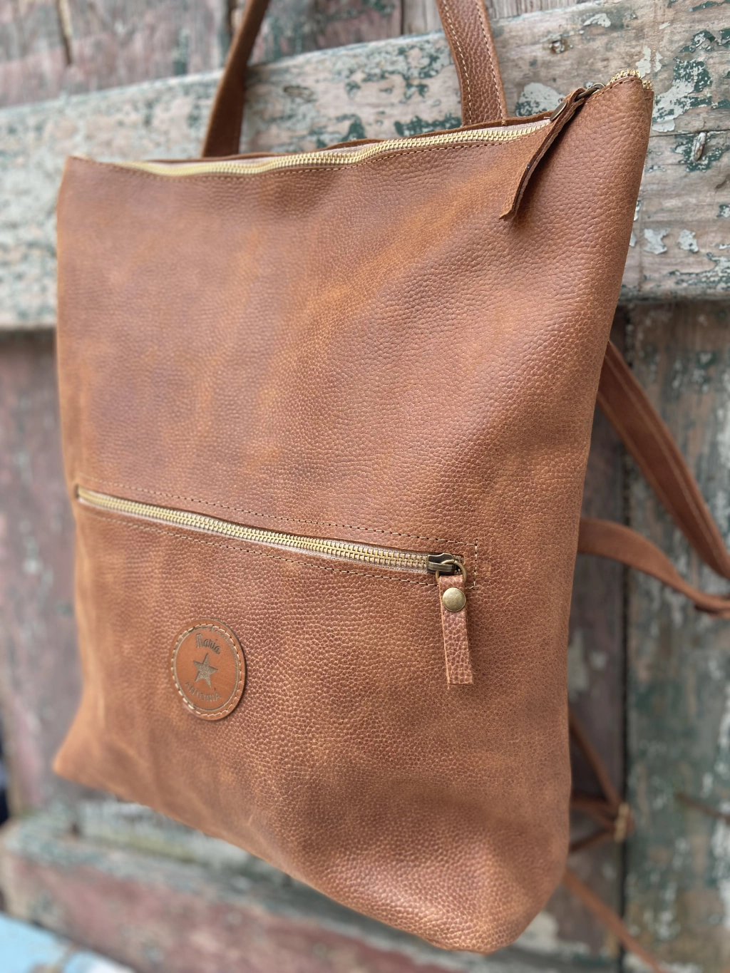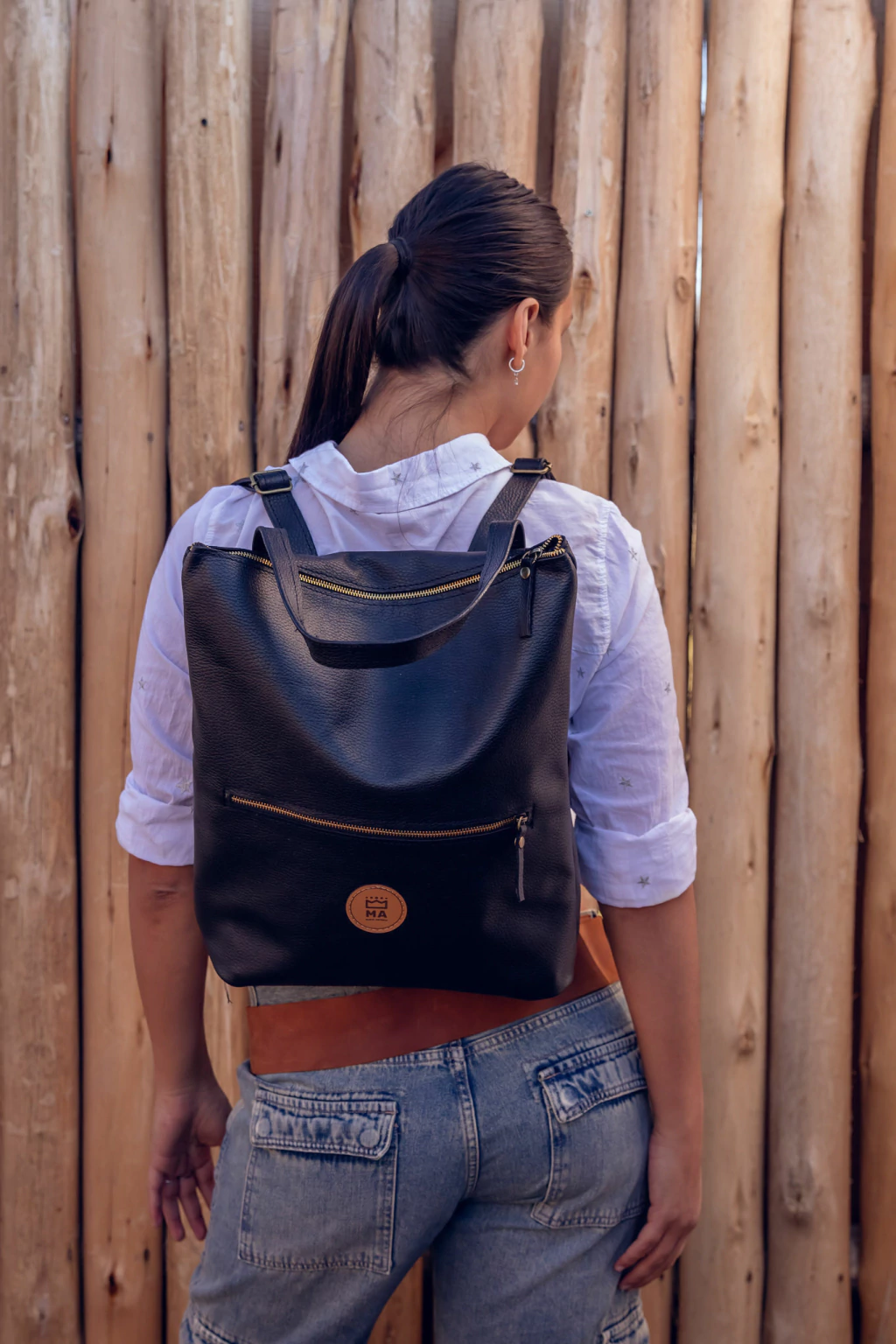 Mochila de cuero con cierres arriba y bolsillo al frente. Bolsillo y forro interno, de lineas simples y con correa para usar como cartera.