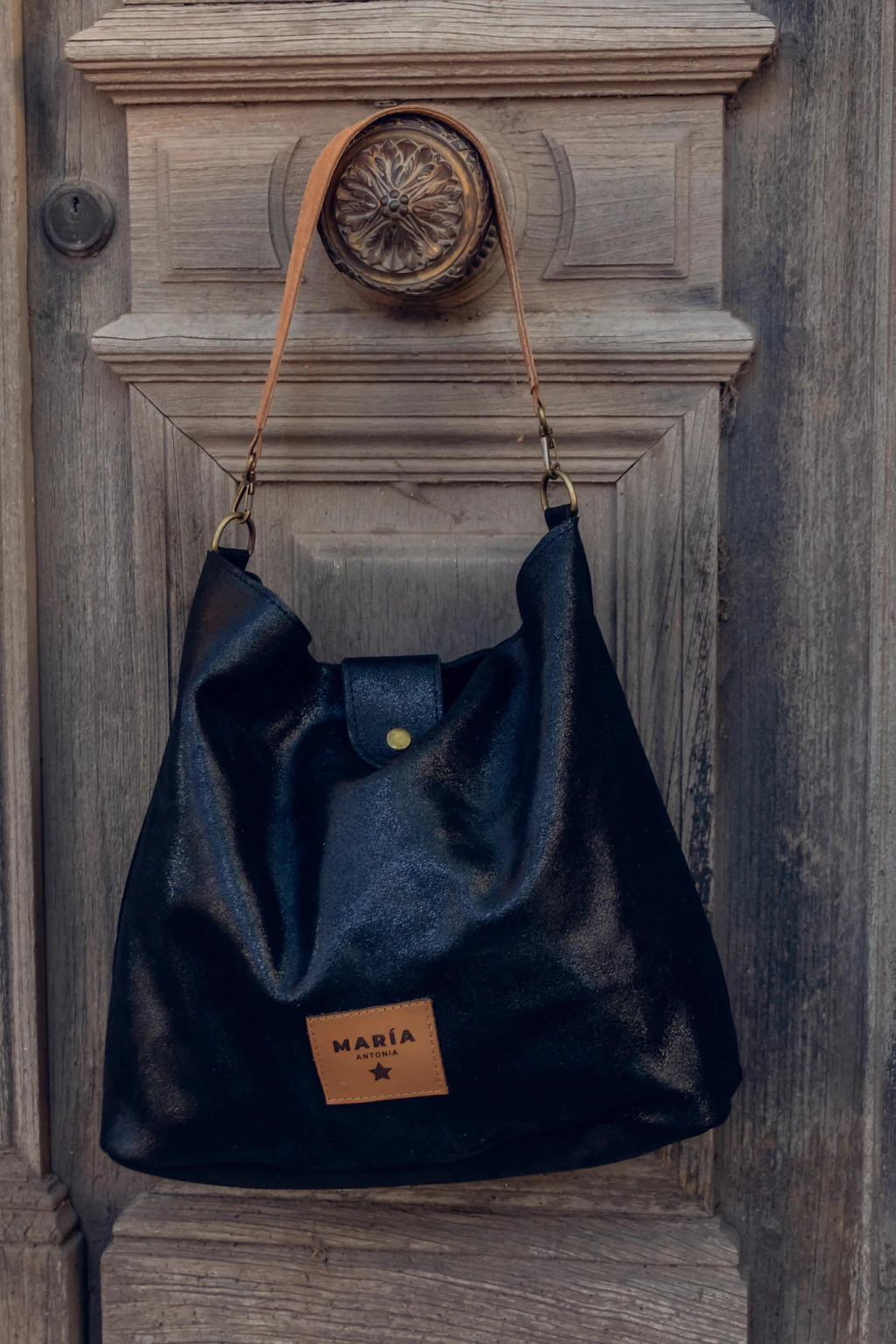 Bolso de Cuero metalizado quebrado con tapita con broche, bolsillo interno, correa en cuero suela. Bolsillo interno con cierre.