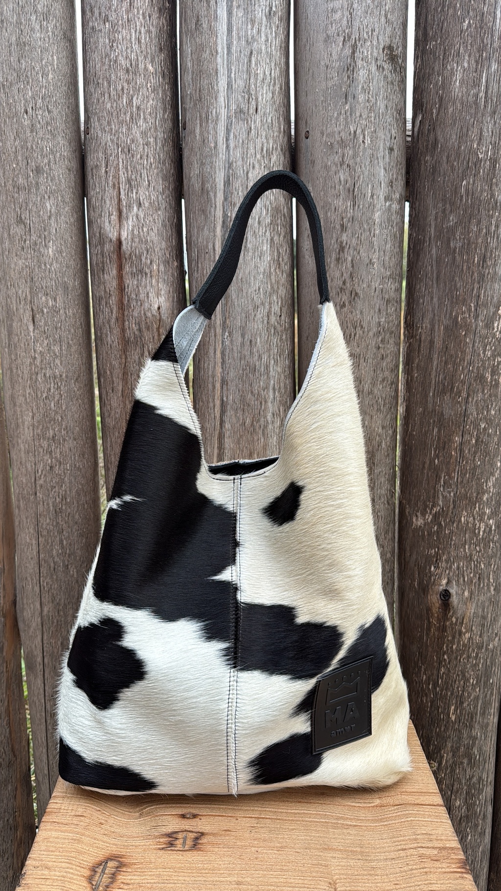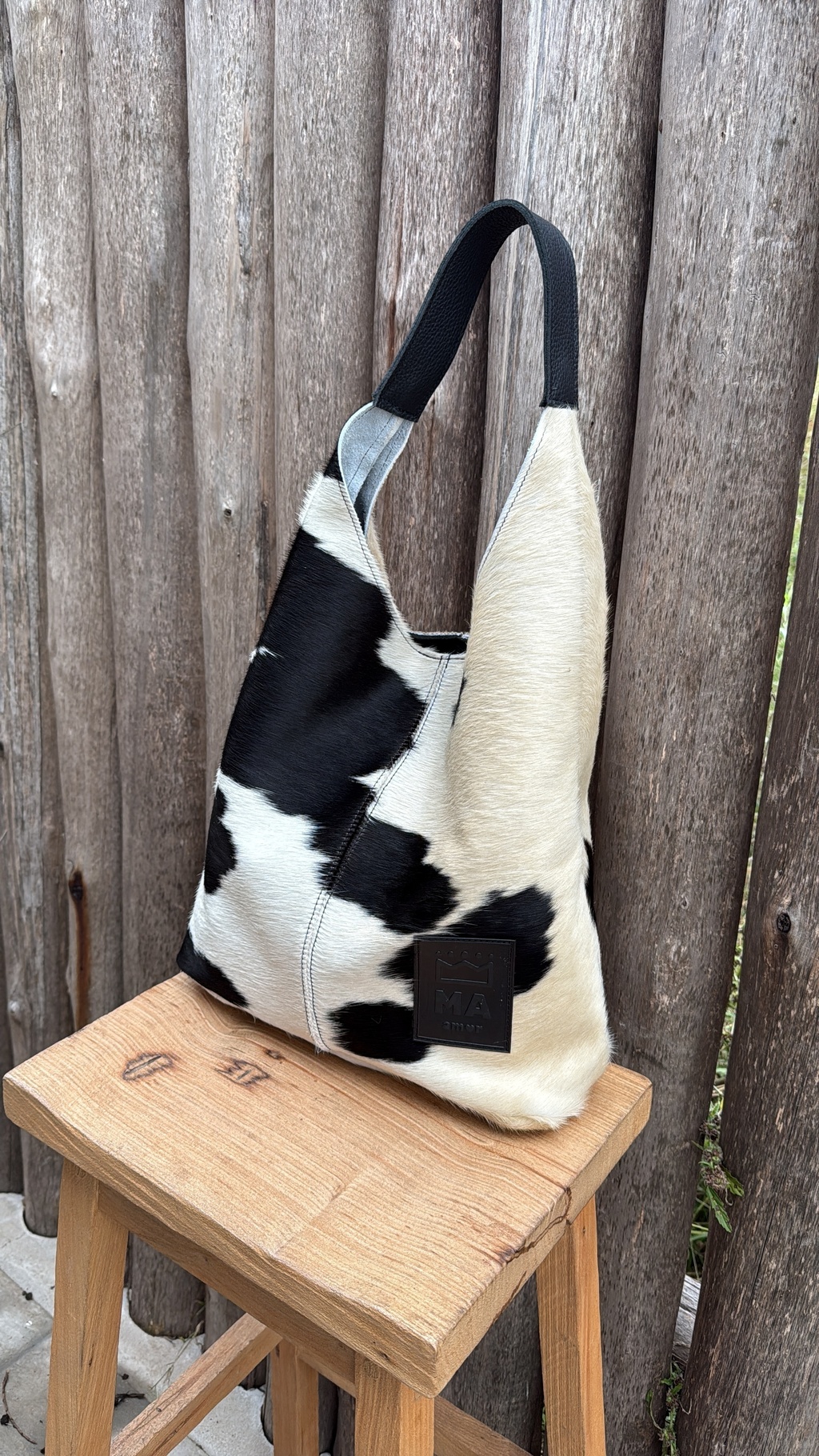 Bolsón de líneas simples, cuero de pelo vaca natural , con correa corta al hombro, tiene imán y bolsillo interno. Medidas: 37x39cm.